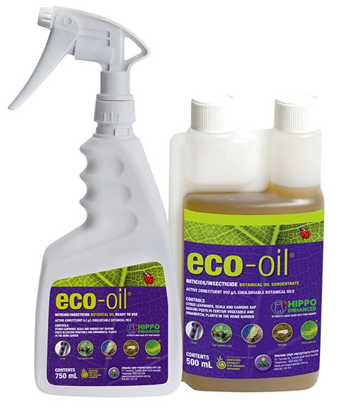 eco-oil is a registered organic miticide and insecticide. It controls a range of problem insects including scale, aphids, two-spotted mite, whitefly, mealybugs and citrus leafminer. Safe for use on veggies, as well as ornamentals, with no withholding period. Spray and eat on the same day! Also safe for beneficial insects like bees, ladybeetles and earthworms.